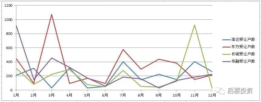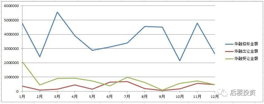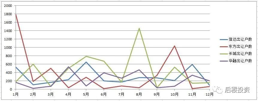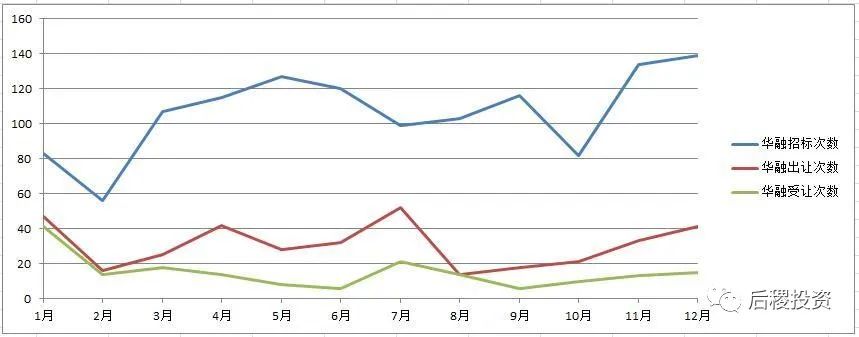 華融的招標規模在全年各月振幅較大,但總體仍舊是在每月350億左右上下浮動。華融的受讓金額曲線要略高于出讓金額曲線一檔,出讓的戶數與受讓戶數曲線糾纏,但出讓次數曲線則明顯略高于受讓次數曲線,此種情況的解釋與長城類似,可能是出讓的債權包以存量居多。
