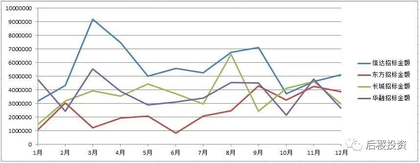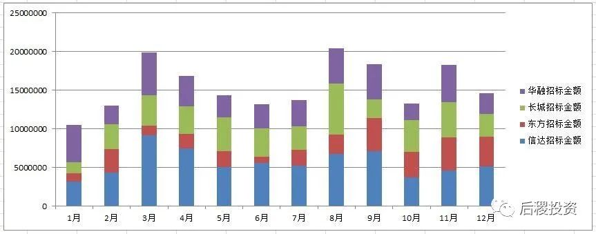 但從招標次數上看,信達在大多數月份里的招標次數均居前,而東方的招標次數則明顯低于其他三大AMC一檔。而從招標戶數上看,四大AMC的全年曲線均出現了糾纏,三月份的層次較為分明,長城在8月份,東方在9月份和11月份較其他AMC要高出不少。而在最重要的招標金額曲線上,全年則體現出層次分明到聚合糾纏的變化,從全年來看,招標規模仍是信達最高,東方最低,而長城和華融相近。從全年的招標總金額看,3月、8月和11月表現略微突出,長城的招標時段是在去年下半年,而其他各AMC則全年較為平均。