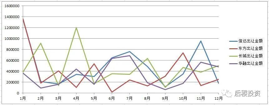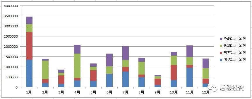 各家AMC出讓的次數表現和招標情況的表現大部分一致,但出讓戶數和金額表現則與招標大相徑庭,出現了全年曲線的糾纏。從總出讓金額上看,全年出讓高峰期是1月、4月、7月和11月,其中以1月最高。由于公告期和業務實際發生期的時間差,實際上每年的債權出讓高峰期應當是12月,屬年底沖量階段。但仔細分析,就會發現實際上1月份的出讓規模,主要是由東方和信達貢獻,而4月份則是由長城貢獻,其他各活躍月份也均是由某個別AMC貢獻較多,并不呈現出所有AMC的出讓情況均隨月份一致變動的情況,這對債權不良資產轉讓存在淡旺季的說法可能是一個挑戰。而實際上,拋開4月份,信達全年的曲線和總金額全年曲線是相當一致的,這也體現了信達在轉讓市場上對市場情況的影響力。