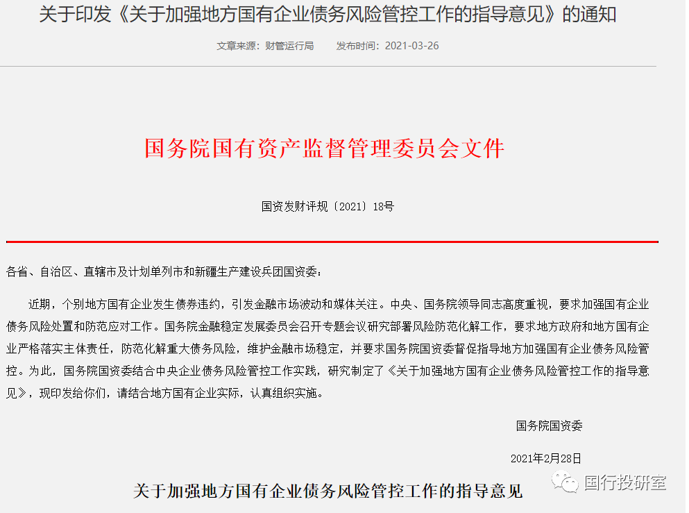 2021年3月26日,國資委官網(wǎng)正式公布《關(guān)于加強地方國有企業(yè)債務(wù)風(fēng)險管控工作的指導(dǎo)意見》(以下簡稱18號文)。18號文的簽發(fā)時間為2021年2月28日,實際上已于近日下發(fā)給各地方國資委。