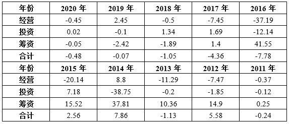 盡管多年大量籌資,信威集團(tuán)現(xiàn)金流在多數(shù)時(shí)間仍為負(fù)值。且從2011年開始,九年時(shí)間未見任何改善,每年都是借新債還舊債來(lái)度過(guò)危機(jī)。