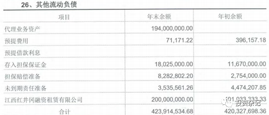 某平臺披露,其18年底其他流動負債余額4.23億元,通過查詢審計報告披露的明細,可以看出其中有2億是江西紅井岡融資租賃有限公司的融資租賃借款,其余是無息負債。
