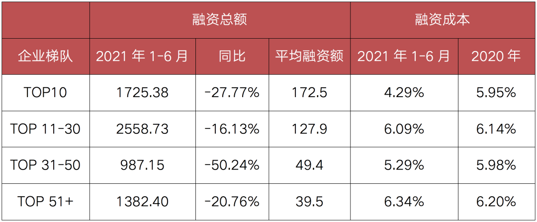 截至2021年6月,100家典型房企新增債券類融資成本為5.59%,較2020年下降0.48個(gè)百分點(diǎn),其中境外債券融資成本達(dá)6.86%,下降0.97個(gè)百分點(diǎn),境內(nèi)債券融資成本4.40%,較2020年下降0.03個(gè)百分點(diǎn)。