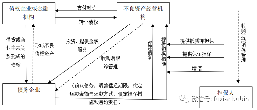 債務(wù)重組是針對(duì)出現(xiàn)流動(dòng)性困難的企業(yè),不良資產(chǎn)經(jīng)營(yíng)機(jī)構(gòu)分別與債權(quán)人、債務(wù)人就還款金額、還款方式、還款時(shí)間等債權(quán)債務(wù)問(wèn)題達(dá)成協(xié)議,通過(guò)更改債務(wù)條款,實(shí)行債務(wù)合并的方式,優(yōu)化該類企業(yè)的資產(chǎn)負(fù)債結(jié)構(gòu)、盤活企業(yè)不良資產(chǎn),幫助企業(yè)渡過(guò)財(cái)務(wù)危機(jī)的一種不良資產(chǎn)經(jīng)營(yíng)模式,其基本業(yè)務(wù)流程如下圖: