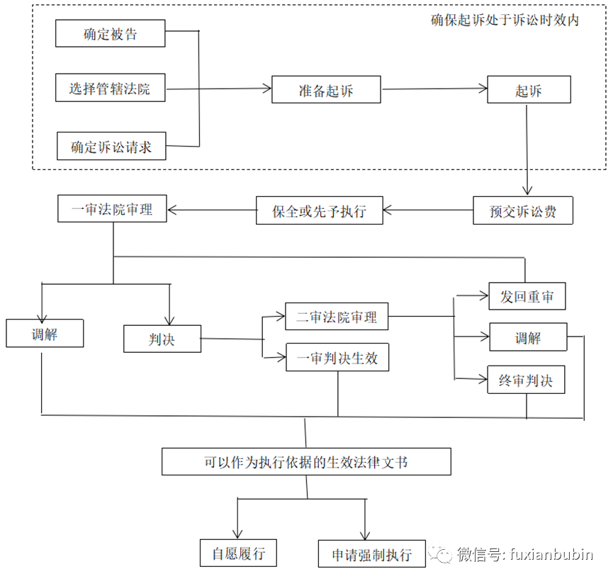 即通過(guò)民事訴訟、民商事仲裁、民事督促(支付令)、執(zhí)行公證債權(quán)文書、直接向法院申請(qǐng)實(shí)現(xiàn)擔(dān)保物權(quán)的方式,確立債權(quán)的合法性,依靠強(qiáng)制程序收回債權(quán)的清收處置方式。其中,訴訟流程較為復(fù)雜,主要如下圖所示:
