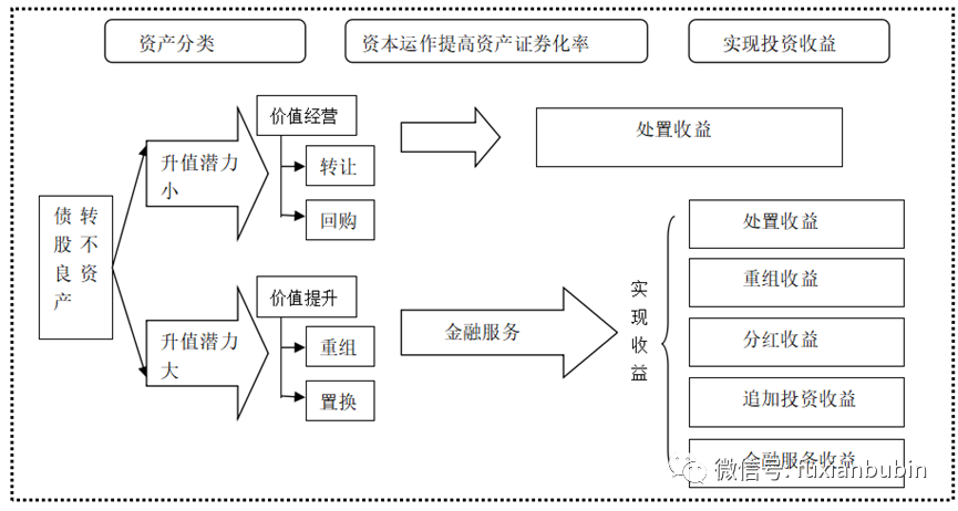 債轉(zhuǎn)股即通過(guò)以股抵債等方式獲得企業(yè)不良資產(chǎn),隨后通過(guò)改善企業(yè)經(jīng)營(yíng)模式逐步提升企業(yè)資產(chǎn)價(jià)值,最終通過(guò)資產(chǎn)置換、并購(gòu)、重組和上市方式等退出,實(shí)現(xiàn)債轉(zhuǎn)股資產(chǎn)增值。其基本模式如下: