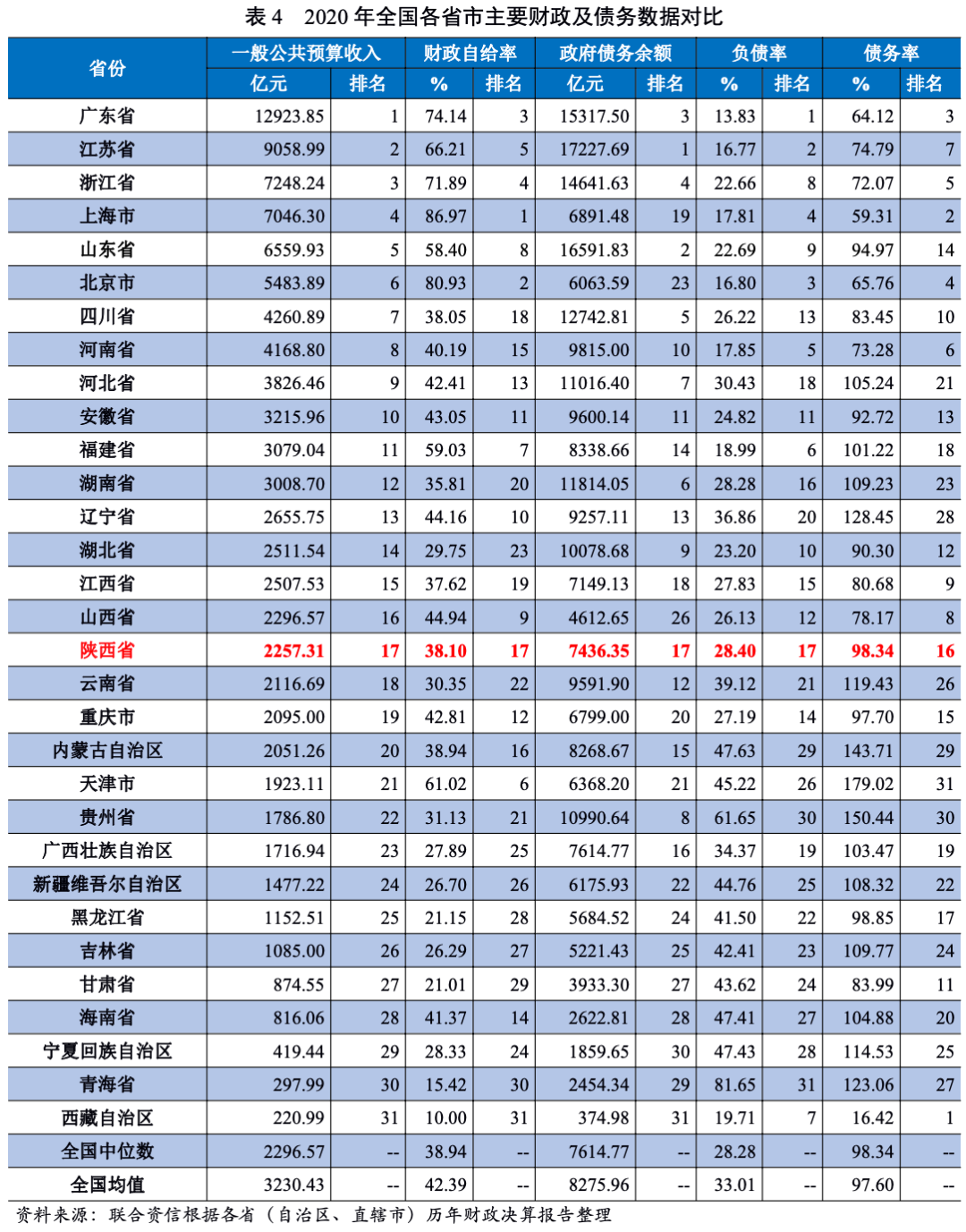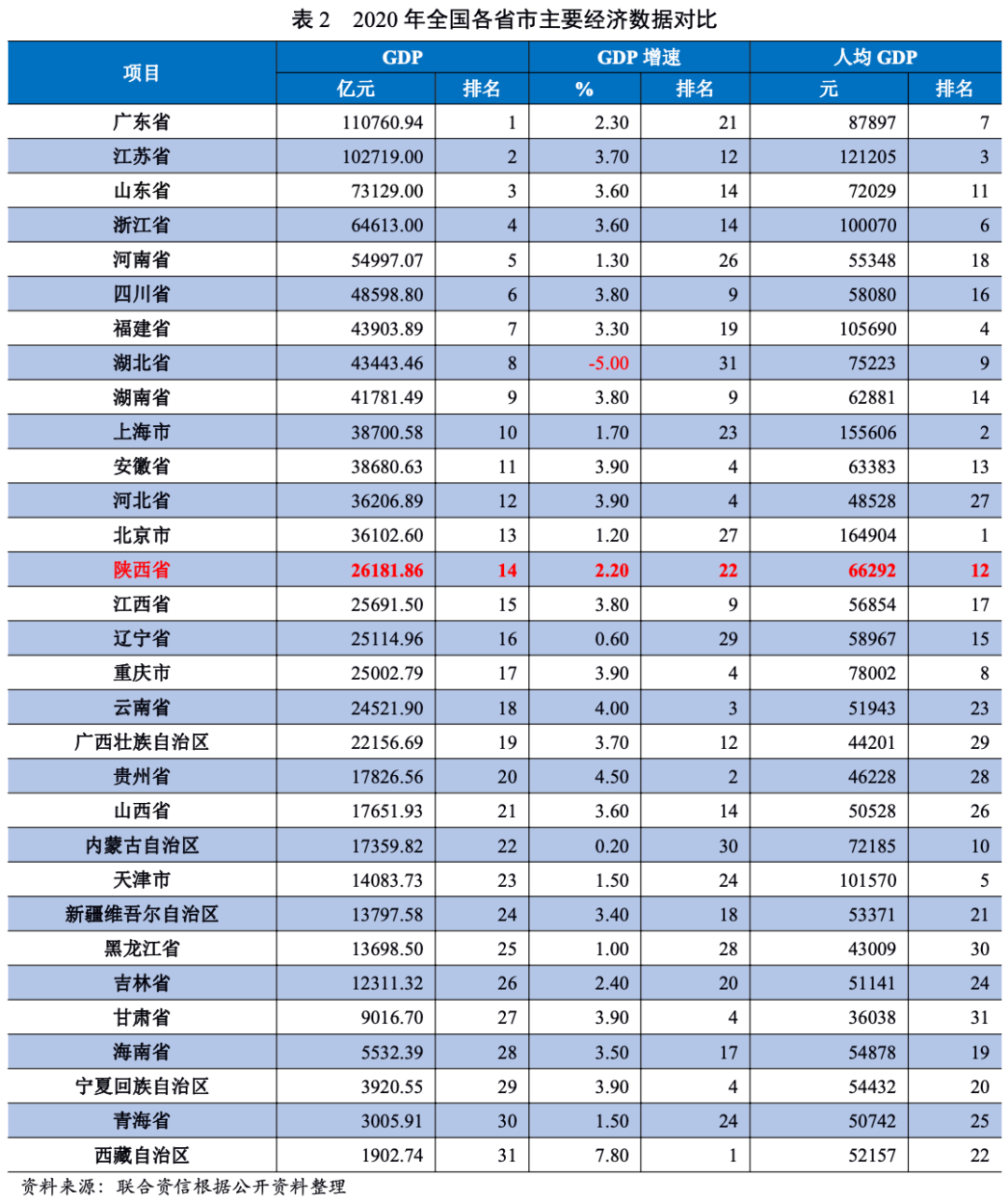 陜西省經濟總量和人均GDP保持全國中游水平。陜西省政府債務余額持續增長,2020年末排名全國第17位