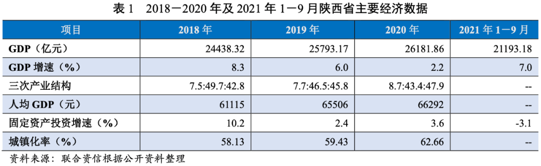 陜西省經濟總量和人均GDP保持全國中游水平。2020年,受新冠肺炎疫情影響,陜西省經濟增速有所放緩,2021年1-9月呈恢復性增長,但固定資產投資后勁不足,整體投資呈負增長狀態。陜西省政府債務余額持續增長,2020年末排名全國第17位,政府債務率與負債率均處于全國中游水平,政府債務風險可控。