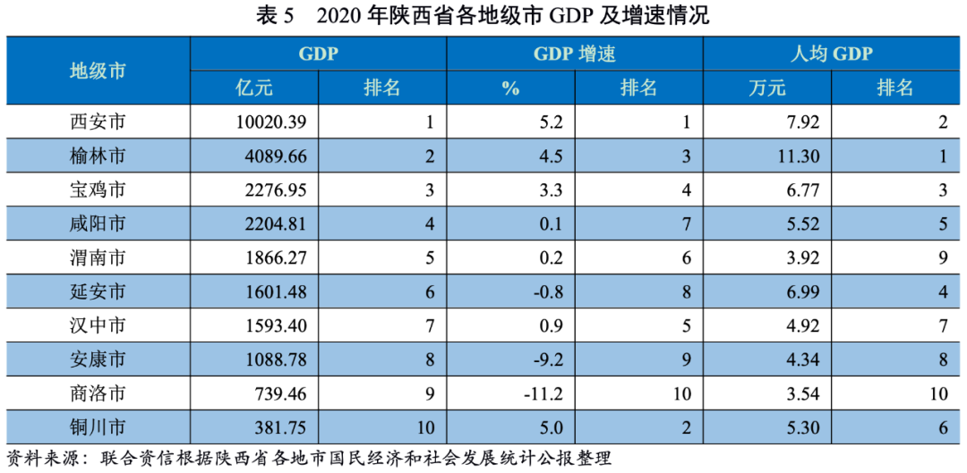 陜西各地級市發展較不均衡,分化較為明顯,省會西安市集聚效應較為明顯,規模優勢顯著,榆林市、寶雞市和咸陽市依次排序,各地級市經濟水平均與西安市差距較大。陜西省各地級市2020年GDP增速普遍放緩,部分地級市出現較大幅度下降甚至表現為負增長。
