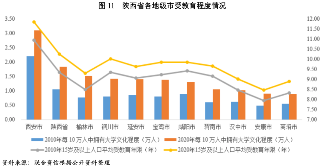 從受教育程度來看,省會西安市匯集了眾多高校、科研院所和科研基地,以航空、航天和軍工科研為代表的相關產業建立了西安閻良國家航空高技術產業基地和西安國家民用航天產業基地等國家級產業基地,人口受教育程度遠高于其他地級市,每10萬人中有大學文化程度的人數為3.10萬人,15歲及以上人口平均受教育年限為10.95年,榆林市擁有大學文化程度人數排名第二。
