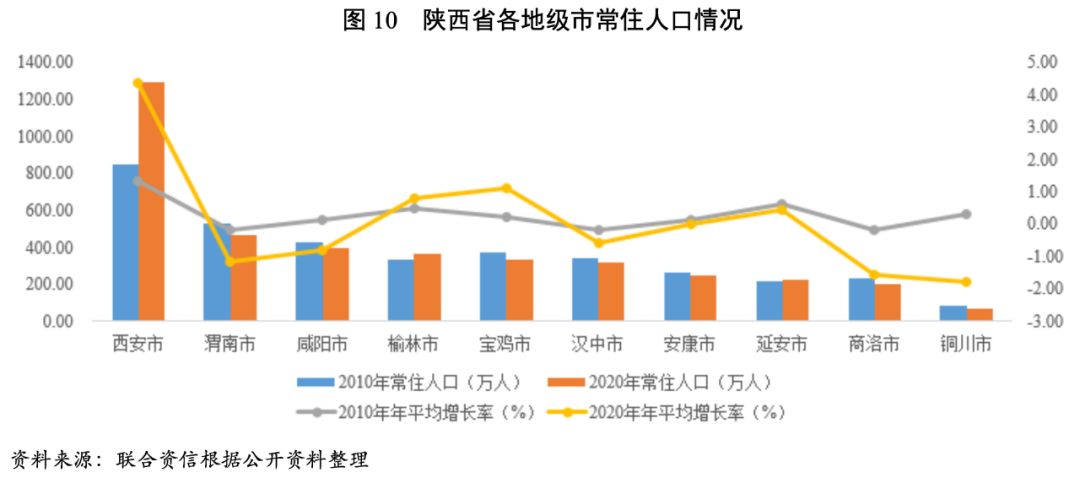 陜西省各地級市常住人口總量和受教育程度分化嚴重,西安市區虹吸效應強,銅川市人口溢出明顯。