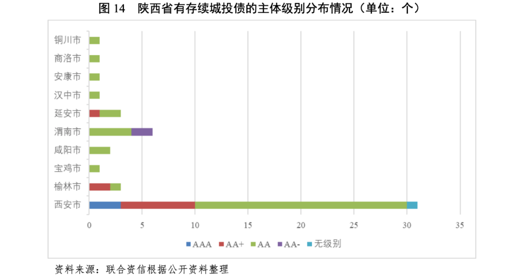 從主體信用級別區域分布看,陜西省城投企業中AAA主體共3家,全部在西安市;AA+級城投企業10家,其中西安市7家、榆林市2家和延安市1家;AA級城投企業34家,占陜西省有存續城投債券的主體數量的68%。高信用級別城投企業集中西安市,區域城投企業主體級別以AA為主。