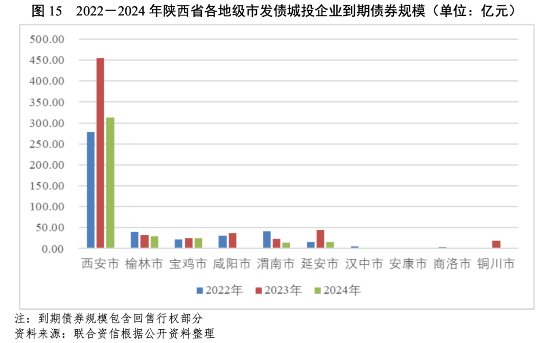 從陜西省各地級市發債城投企業未來三年(2022-2024年)到期債券規模看,西安市發債城投企業未來三年到期債券規模較大,安康市無未來三年內到期債券,其他地級市城投企業到期債券規模相對較小。從陜西省各地級市發債城投企業未來三年到期債券規模占已發行債券規模的比重看,寶雞市、漢中市、商洛市和銅川市發債城投企業存續債券將于未來三年內全部到期,其他地級市(除安康市外)占比在60%~90%之間。
