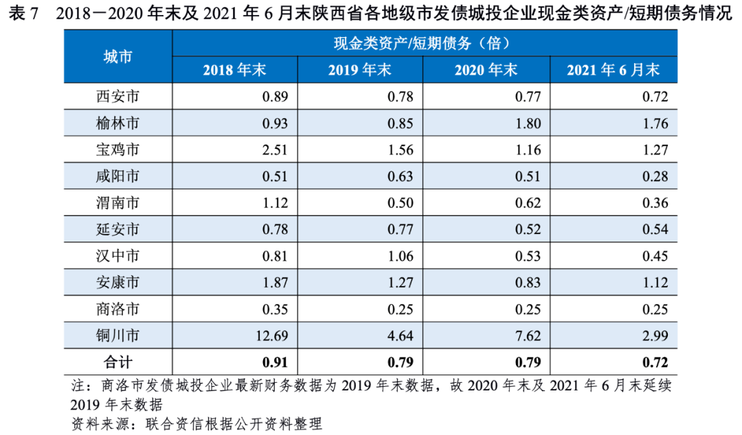 2020年以來,陜西省大部分發債城投企業債務負擔有所上升,貨幣資金對短期債務的覆蓋程度有所下降,其中咸陽市、延安市和漢中市短期償債能力相對較弱。