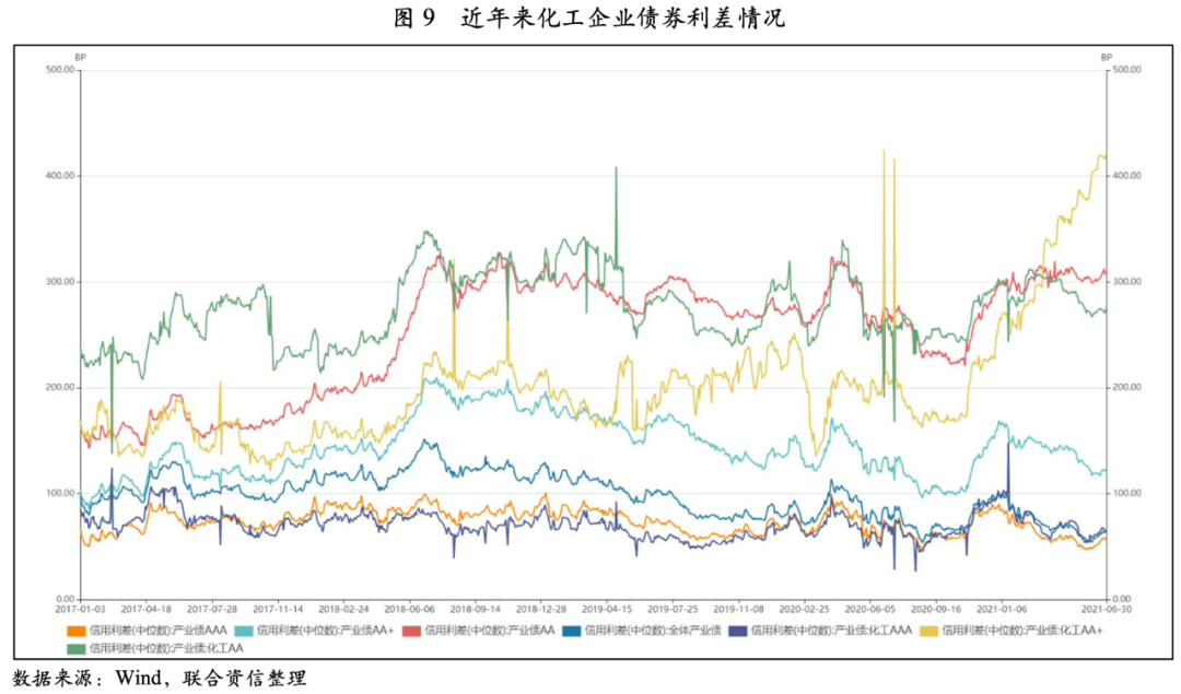 從債券市場來看,2021年下半年化工行業債券到期規模較大,雖然美聯儲Taper漸行漸近,全球流動性拐點將至,但國內貨幣政策大概率保持穩健,國內化工行業景氣度仍將處于較高水平,企業高盈利水平將保持延續。總體看,2021年下半年化工行業整體信用風險較小,評級展望為穩定。
