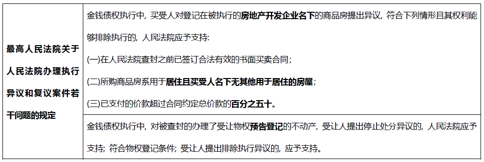 值得注意的是, 已辦理預告登記的受讓人同樣可以排除抵押權人的執行, 并且無需符合上述條件。因此,建議金融機構作為債權人在接受或行使在建工程抵押權時, 對物權預告登記情況進行核查, 以免權利落空或徒增執行異議司法程序的不便。而受讓出險房企的預售期房的相對安全模式顯然也是辦理預告登記。
