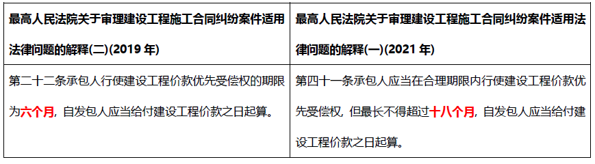 有觀點認為, 根據《時間效力規定》第二條規定, 民法典施行前的法律事實引起的民事糾紛案件, 當時的法律、司法解釋有規定, 適用當時的法律、司法解釋的規定, 但是適用民法典的規定更有利于保護民事主體合法權益, 更有利于維護社會和經濟秩序, 更有利于弘揚社會主義核心價值觀的除外, 從更好保護施工人合法權益的角度出發, 應適用十八個月。例如新疆維吾爾自治區高級人民法院在(2021)新民終114號民事判決書即持有此觀點。
