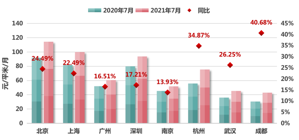 其中,北京、上海、廣州、深圳、南京、杭州、武漢、成都為租賃市場較為典型的核心八個城市,核心八城個人房源租金水平來看,達到73.08元/平米/月,相比去年同期平均水平大幅上漲24.55%。