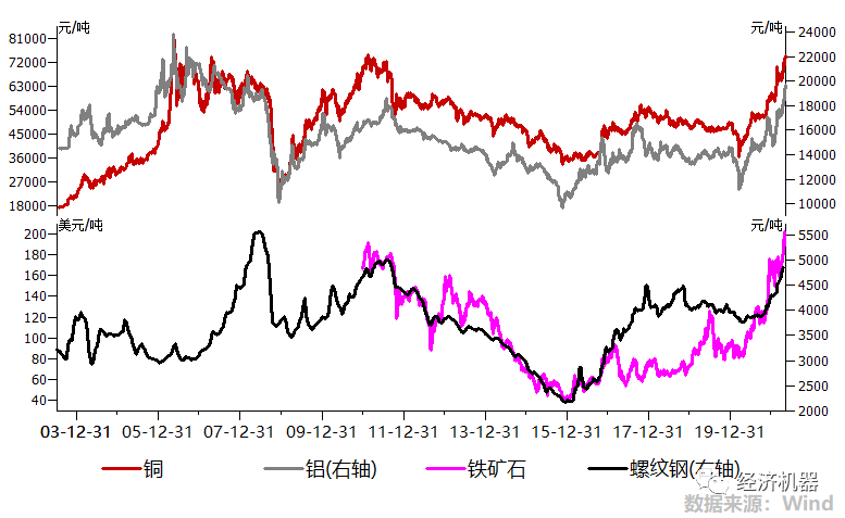 從大宗商品價格看,更是持續(xù)暴漲,近期紛紛創(chuàng)出近十年新高。倫銅突破1萬美元/噸;滬鋁突破19000元/噸,超過了2009年“四萬億”時期的高點;螺紋鋼價格突破5600元/噸,已經(jīng)是歷史新高(圖2)。