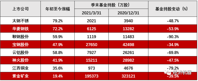 這波大宗商品暴漲,起始于2020年3月疫情期間,主要是政策刺激預期疊加疫情帶來的供應鏈中斷。從個股的機構(gòu)持股看,2020年四季度,大部分漲勢較好的周期龍頭基金持股都出現(xiàn)了明顯增加,表明雖然權(quán)益市場較商品市場滯后兩個季度啟動,但也基本有效地反映了基本面的改善。