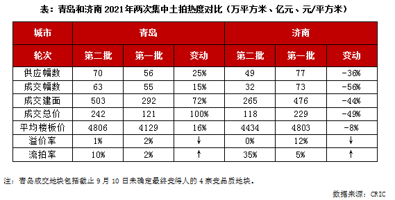 1) 溢價率上限明顯下調:青島和濟南本次出讓所有涉宅地塊的最高溢價率均限制在15%以內,而首輪兩個城市均有地塊成交溢價率超過60%。