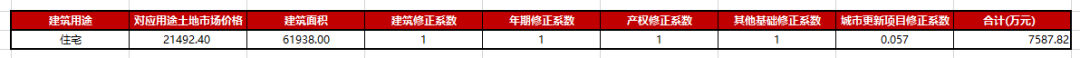 (3)住宅用途項目修正系數(shù)=∑(“用地類別或改造類型”面積占比×對應(yīng)修正因子)=80.5%×0.045+19.5%×0.11=0.036+0.021=0.057
