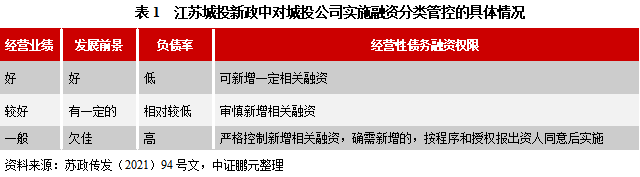 建立城投公司資產負債約束指標,并按不同行業、不同類型、不同評級實行融資限額和負債比率管理。分類管控的具體情況如下表所示,不過值得注意的是新政在提供分類標準時均采用了定性描述,這有可能會增加實踐中的歸類困難。但也不排除另外一種可能,文件只是原則性要求,實踐中會有詳細的定量的分類標準。