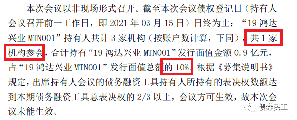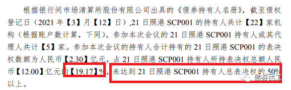 4、2021年3月16日,“”第一次持有人會(huì)議的持有人所持有的表決權(quán)數(shù)額未達(dá)到本期債務(wù)融資工具總表決權(quán)的三分之二以上,持有人會(huì)議無效。主承銷商在3月19日也公告,