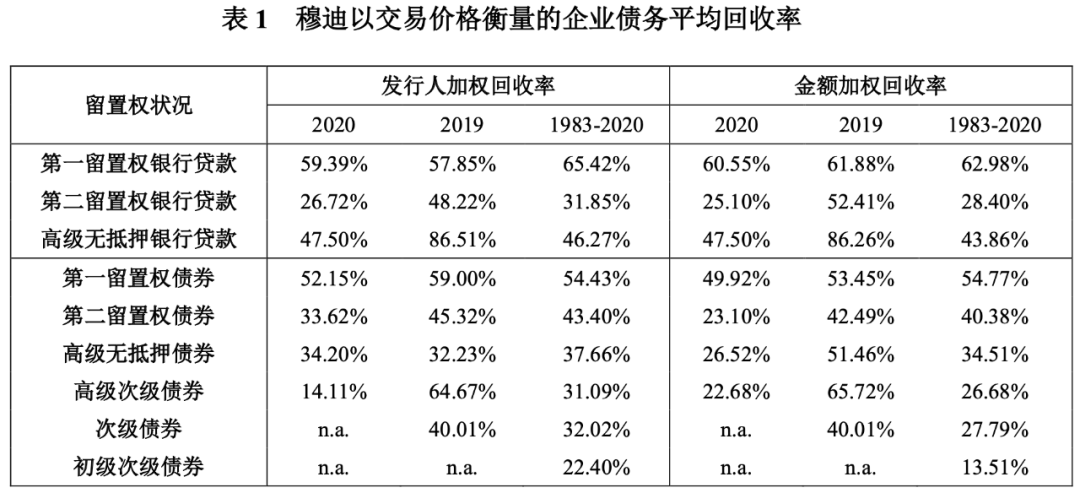 以穆迪違約事件定義為例,最終回收的價(jià)值是當(dāng)發(fā)行人結(jié)束破產(chǎn)狀態(tài)(通常為首個(gè)違約日后的1-2年)時(shí)、不良交易(distressed exchanges)完成時(shí)或?qū)捪奁谕馕茨馨醇s定支付或延期支付的金額得到償還時(shí),債權(quán)人實(shí)際獲得的現(xiàn)金和/或證券的現(xiàn)值。