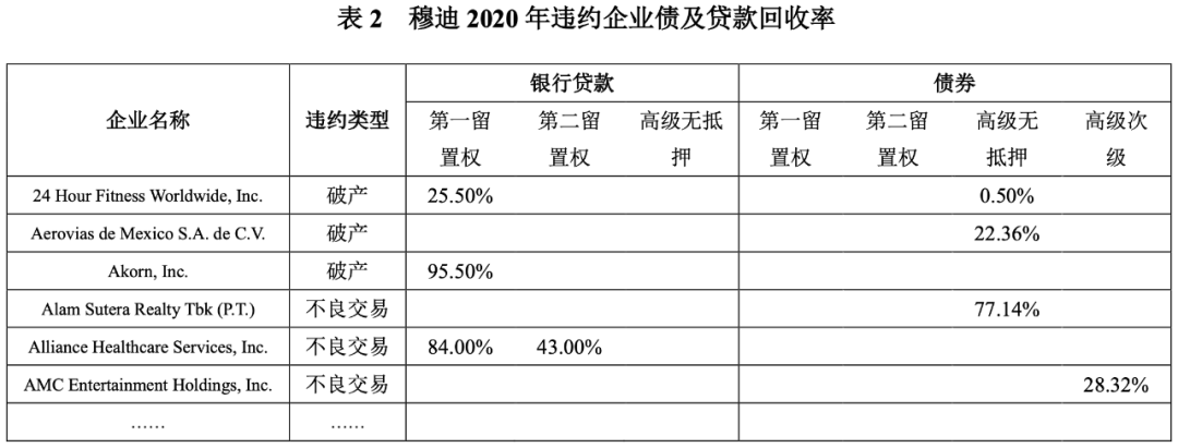 其次,穆迪年度違約和回收率報(bào)告的附件中,還會(huì)列示以交易價(jià)格衡量的當(dāng)年各違約企業(yè)債及貸款的回收率。以2020年度報(bào)告為例(詳見表2),本年違約企業(yè)24 Hour Fitness Worldwide, Inc的以交易價(jià)格衡量的高級(jí)無抵押債券的回收率為0.50%。