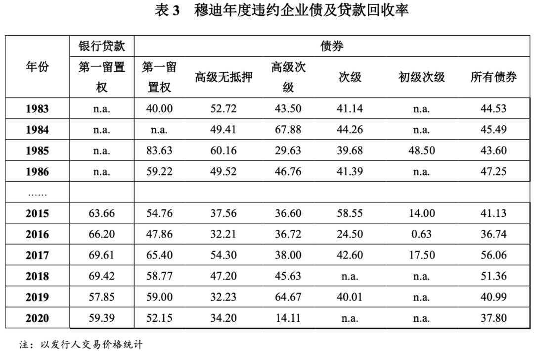 此外,報(bào)告附件中還列示了從1983年以來違約企業(yè)債及貸款的年度回收率水平。以2020年度報(bào)告為例(詳見表3),2020年基于交易價(jià)格的高級(jí)無抵押債券的回收率水平為34.20%。