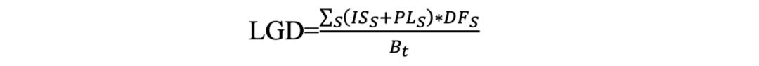 穆迪指出在結(jié)構(gòu)金融產(chǎn)品中LGD的計(jì)算公式[5]為,凈損失現(xiàn)值的總和(包括利息和本金損失)以債券的票面利率折現(xiàn),并除以某一特定日期的本金余額,即: