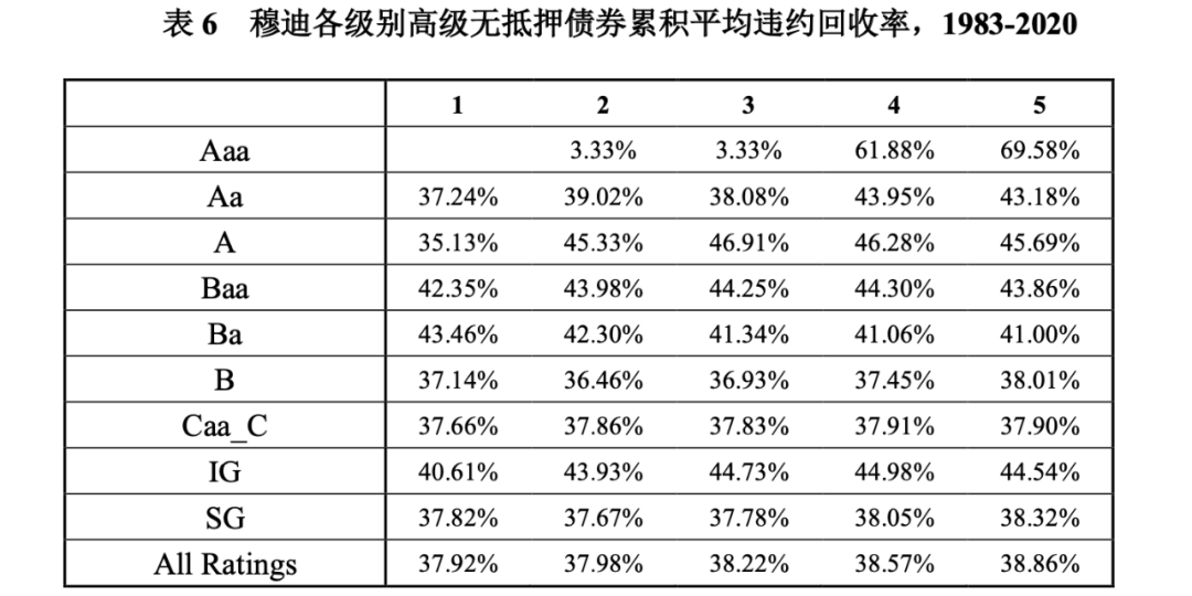 根據(jù)穆迪公開資料顯示,平均違約回收率是指特定信用級(jí)別的債務(wù)工具多年期平均違約回收水平。以2020年度報(bào)告為例,表4列出高級(jí)無抵押債券在違約前一年至前五年對應(yīng)的信用級(jí)別的平均回收率,違約前2年為B級(jí)別的平均回收率為36.46%,是指違約兩年前為B級(jí)的高級(jí)無抵押債券在兩年內(nèi)一定時(shí)間的平均回收率水平為36.46%。