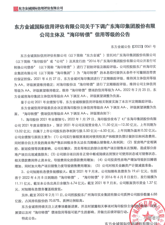 2月25日,東方金誠公告稱,決定將海印股份(000861.SZ)主體信用等級由“AA”下調至“AA-”,評級展望由“穩定”調整為“負面”,“海印轉債”債項信用等級由“AA”下調至“AA-”。