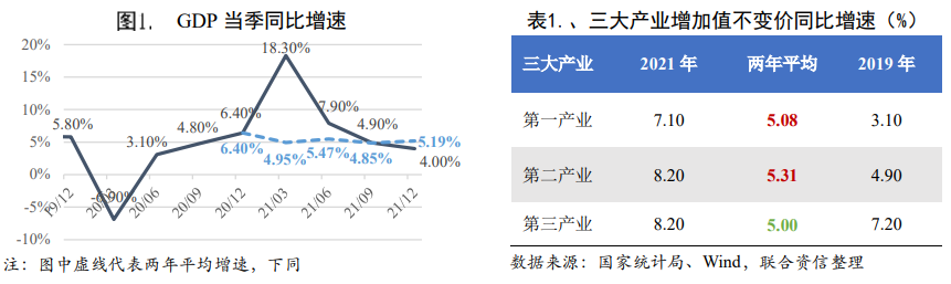 政策回歸常態(tài)化等背景下,我國經(jīng)濟上半年持續(xù)復(fù)蘇,三季度經(jīng)濟增長有所放緩,四季度小幅改善。經(jīng)初步核算,2021年我國國內(nèi)生產(chǎn)總值114.37萬億元,按不變價計算,同比增長 8.10%,兩年平均增長[1]5.11%。分季度來看,GDP 當(dāng)季同比增速在基數(shù)影響下逐季回落。從兩年平均增速來看,上半年我國經(jīng)濟穩(wěn)定修復(fù);三季度 GDP 增速明顯回落,主要受供給端約束和內(nèi)生動能不足的共同影響;隨著保供穩(wěn)價和助企紓困政策有力推進,供給端限電限產(chǎn)的約束有所改善,四季度經(jīng)濟增長有所加快。