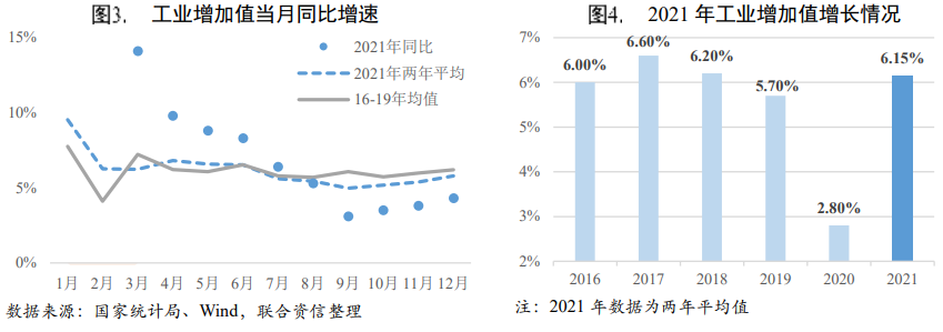 工業(yè)生產(chǎn)基本恢復(fù)到疫情前水平,上半年表現(xiàn)強勢,三季度觸底后四季度小幅回升。2021年全國規(guī)模以上工業(yè)增加值同比增長9.60%,兩年平均增長6.15%,基本接近疫情前水平。2021年上半年工業(yè)增加值當(dāng)月同比增速在基數(shù)的影響下呈下行趨勢,剔除基數(shù)因素后,1-6月當(dāng)月兩年平均增速除了3月外均高于2016-2019年同期均值水平,上半年我國工業(yè)生產(chǎn)表現(xiàn)較為強勢。三季度受國際大宗商品價格不斷上漲、能耗雙控以及缺芯等供應(yīng)鏈緊張問題影響,工業(yè)生產(chǎn)同比增速與兩年平均增速變化趨勢均有所回落。隨著能源供應(yīng)保障有所加強、穩(wěn)定市場價格等政策措施成效顯現(xiàn)、國外疫情反彈,四季度工業(yè)生產(chǎn)呈現(xiàn)小幅回升態(tài)勢,但仍低于2016-2019年同期均值水平。