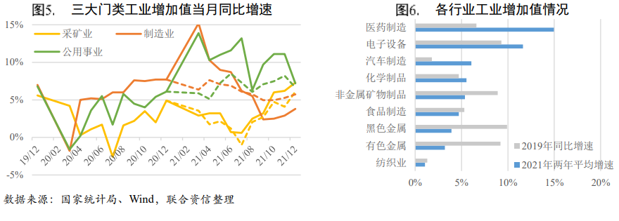 三大門類均實現(xiàn)較快增長。2021年,采礦業(yè)、制造業(yè)以及電力、熱力、燃氣及水生產(chǎn)和供應(yīng)業(yè)增加值同比分別增長5.30%、9.80%、11.40%,兩年平均增速分別為2.87%、6.55%、6.60%。主要行業(yè)[2]方面,醫(yī)藥制造業(yè)、計算機、通信和其他電子設(shè)備制造業(yè)以及汽車制造業(yè)受出口帶動2021年工業(yè)增加值兩年平均增速較高,但受芯片、電池等供應(yīng)鏈短缺影響,下半年特別是8月汽車制造產(chǎn)能擴張承壓;而黑色、有色金屬冶煉及延壓加工業(yè)和非金屬礦物制品業(yè)工業(yè)增加值兩年平均增速較2019年下降較大,主要是限電限產(chǎn)等措施對鋼鐵、有色和水泥等高耗能行業(yè)產(chǎn)能負面影響較大,其中鋼鐵工業(yè)增加值兩年平均增速繼續(xù)下滑,除了供給端的限制外,還受到需求端地產(chǎn)降溫的影響。
