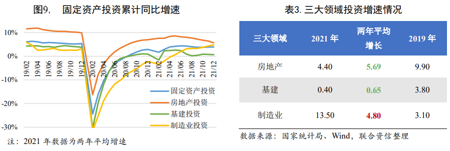 三大產(chǎn)業(yè)方面,2021年第一、二產(chǎn)業(yè)增加值兩年平均增速均高于疫情前2019年的水平,恢復(fù)情況良好;而第三產(chǎn)業(yè)增加值兩年平均增速仍未回到疫情前水平,主要是服務(wù)業(yè)受局部疫情反復(fù)影響較大。
