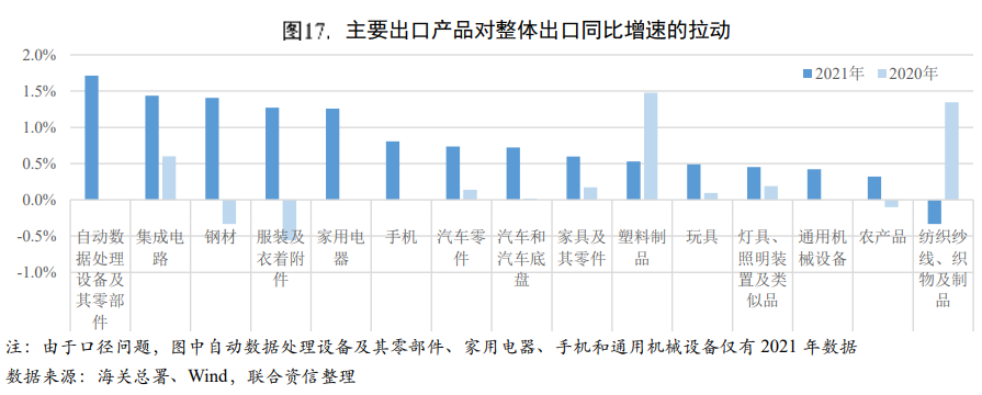 海外產(chǎn)需缺口、出口替代效應(yīng)以及低基數(shù)等因素支撐我國出口高增長。2021年主要經(jīng)濟體PMI高位運行,全球經(jīng)濟持續(xù)恢復(fù),海外需求旺盛但產(chǎn)需依然存在較大缺口,加之東南亞疫情反復(fù)導(dǎo)致的出口替代作用,共同支撐我國出口維持高景氣度。但海運領(lǐng)域出現(xiàn)的集裝箱運力緊張、運價高漲問題對出口產(chǎn)生了一定的負面影響。三季度以來出口價格上漲對出口金額的貢獻度上升,集成電路、手機和家用電器等受大宗商品漲價明顯的行業(yè),出口均表現(xiàn)出量減價增的特點。從主要出口產(chǎn)品對整體出口同比增速的拉動來看,自動數(shù)據(jù)處理設(shè)備及其零部件、集成電路依然是出口的最大拉動項;紡織紗線、織物及制品由于上年基數(shù)較高,對出口造成負向拉動。