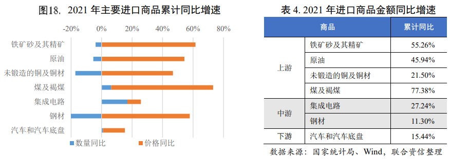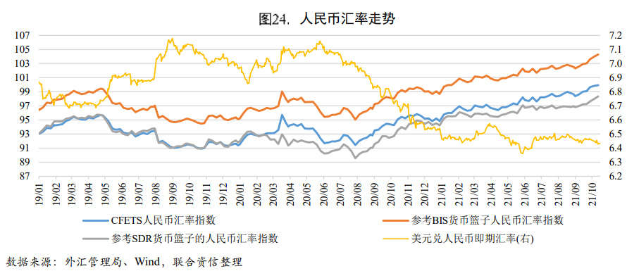 國際大宗商品漲價、人民幣升值等多重因素帶動進口金額增長。價格因素支撐主要進口商品金額高增長:鐵礦砂及其精礦、原油和未鍛造的銅及銅材、煤及褐煤、鋼材以及汽車和汽車底盤進口金額增長主要由價格大幅增長拉動;僅集成電路的數(shù)量增速高于價格增速,表明數(shù)量因素對金額增長的貢獻大于價格拉動。多數(shù)商品呈現(xiàn)量減價揚的特點,國際大宗商品價格的上漲抑制了部分國內(nèi)需求。此外,2021年以來人民幣匯率三大指數(shù)同步提升,人民幣升值一定程度上也對擴大進口產(chǎn)生了積極作用。