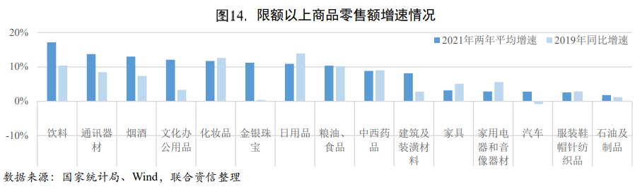 限額以下商品零售和接觸性服務(wù)仍是消費的主要拖累。2021年商品零售額同比增長11.80%,兩年平均增長4.51%,不及疫情前水平(2019年為7.90%)。商品零售與疫情前差距主要體現(xiàn)在限額以下的部分:2021年限額以下商品零售額兩年平均增速僅為3.01%,與疫情前2019年的增速水平(11.95%)相差較大。限額以上商品零售額兩年平均增速均為正值,汽車銷售上半年表現(xiàn)強勢,而自二季度以來受芯片供應(yīng)短缺以及排放標(biāo)準(zhǔn)升級切換期等影響較大,汽車零售額兩年平均增速多次落入負值區(qū)間。餐飲收入受疫情沖擊較大,2021年餐飲收入同比增長18.60%,兩年平均下降0.55%,餐飲消費規(guī)模仍不及疫情前水平。餐飲收入等接觸性消費由于對疫情變化更為敏感,整體波動較大且較疫情前水平差距較大,仍有較大的恢復(fù)空間。