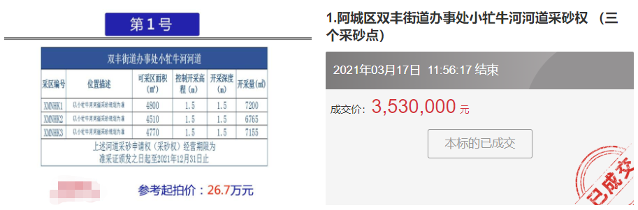 本標的是位于哈爾濱市阿城區(qū)雙豐街道辦事處小牤牛的河河道采砂權,其起拍價格為267,000元,歷經2小時的激烈競價之后以3,530,000元的價格成交,實現(xiàn)了3,263,000元的溢價,溢價率高達1200%。這般激烈競價,真是讓人大開眼界!