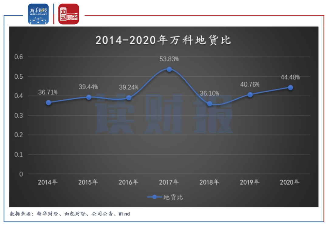 追溯萬科過往拿地及銷售數據發現,2014-2016年,公司地貨比維持35%以上水平,2017年為53.83%,達到近年來的最高水平,也意味著當期拿地項目毛利率較低。2018年,公司地貨比有所下降但仍維持在35%以上,2019-2020年連續兩年維持40%以上水平,且自2018年以來呈現持續上升態勢,一定程度上說明近兩年來公司拿地項目毛利率持續下降。