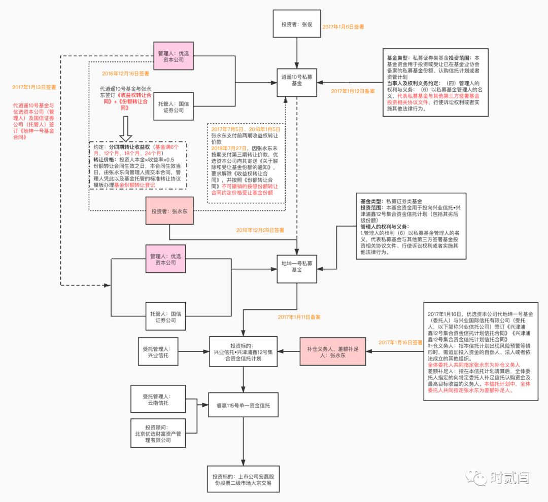 2017年1月16日,優選資本公司代地坤一號基金(委托人)與興業國際信托有限公司(受托人)簽訂《興津浦鑫12號集合資金信托計劃信托合同》,約定投資于投資于云南信托公司設立的“睿贏115號單一資金信托,最終投向上市公司宏磊股份股票二級市場大宗交易。
