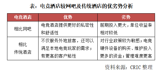 對于消費者而言,電競酒店與傳統(tǒng)網(wǎng)吧相比提供了更好的私密性和舒適性。而與傳統(tǒng)酒店相比,電競酒店不僅能給外來旅客提供住宿和服務,還能吸引當?shù)氐碾姼偼婕以诟玫沫h(huán)境里聚集,相對來說客戶粘性更高。但電競酒店從根本上來說還是以酒店模式運營,其重資產(chǎn)模式并未改變,電競硬件設備的購買、維護及管理需要投入更多的資金,不僅考驗房企長期的酒店管理及運營能力,也更考驗電競酒店的品牌打造和造勢宣傳。