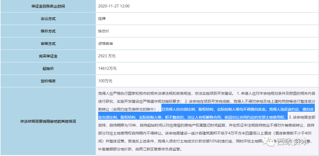 2020年11月20日《珠海市國有建設用地使用權網上掛牌出讓公告》(交易序號:20215)的規定示例: