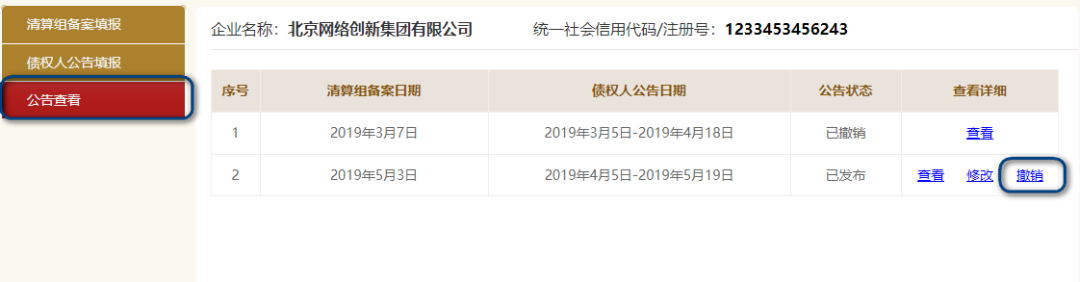 5.3撤銷了清算組備案和債權人公告的,提示“該企業已撤銷清算組備案(債權人公告)。”該提示信息會保留45天,45天后自動取消。