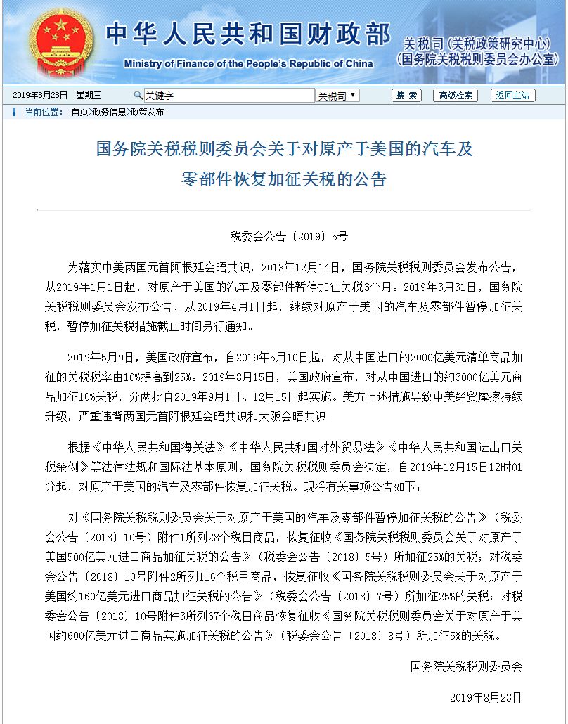 對(duì)此,8月23日晚,中國(guó)財(cái)政部發(fā)布公告恢復(fù)對(duì)原產(chǎn)于美國(guó)的汽車及零部件關(guān)稅征收,并公布了對(duì)原產(chǎn)自美國(guó)商品加征新關(guān)稅的計(jì)劃,將有5078個(gè)稅目、約750億美元的商品被加征10%、5%的關(guān)稅,且將在9月1日和12月15日分兩批實(shí)施。
