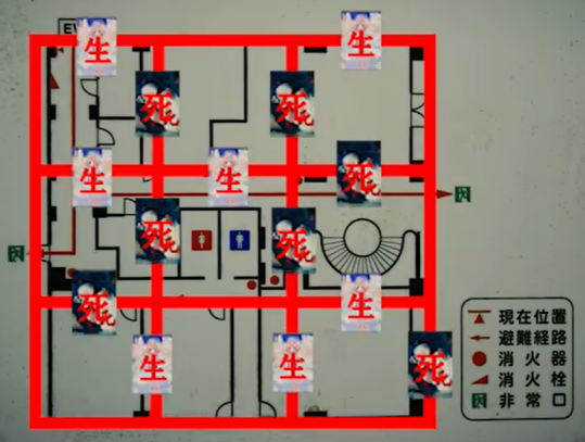 其一,密室的整體路線及配套提示設計。以知名的日本漫改、奈飛影視作品《彌留之國的愛麗絲》第一關的密室逃殺為例,整個密室以消防通道線路圖為藍本,以九宮格的形式構建了每一處小密室的“生門”、“死門”在打開后對應的劇情后果,并通過長度、轉角、消防圖例設施設備、NPC提示等給予玩家推測依據,從而破解該密室的正確開門選項和逃脫路徑。