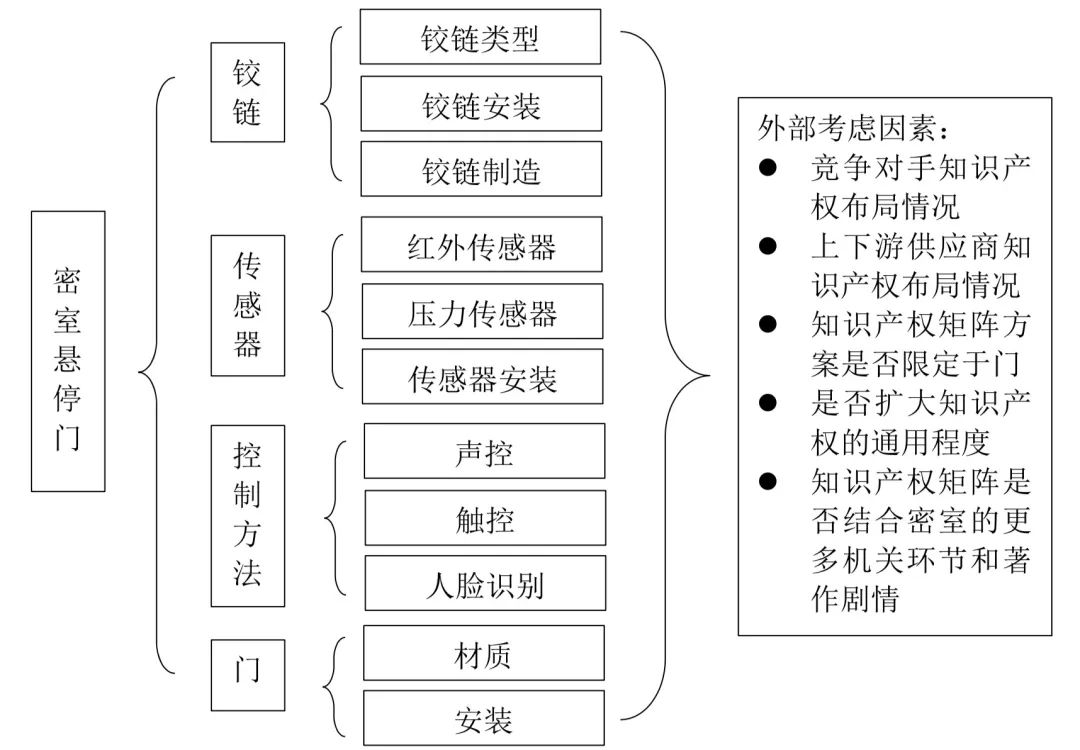 這樣一扇看似平平無奇的懸停門,倘若結合密室游戲所希望實現的效果去進行了專門設計,那么可挖掘的專利點其實有很多,足以構建專利矩陣(注:本文在此僅提供相關思路,并非主張實際中必然按照本文的思路進行專利矩陣申請)——我們可以從密室懸停門的主要結構件為出發(fā)點,通過鉸鏈、傳感器、控制方法、門面等引子,進行如下構件拆解和專利挖掘。